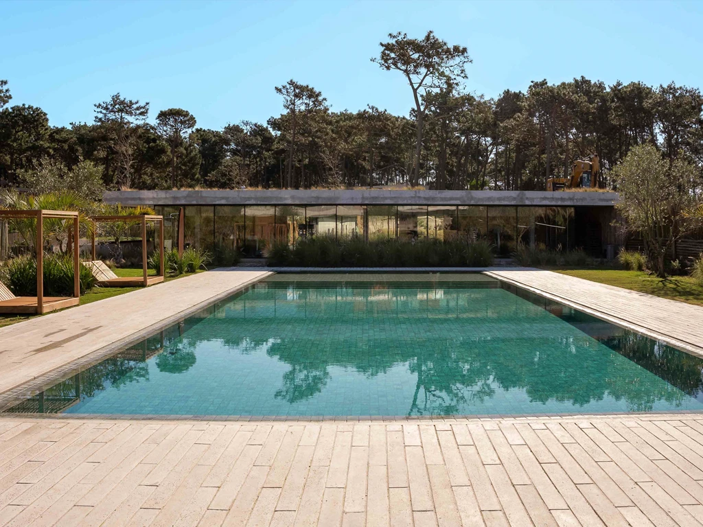 - Piscina central rodeada de sectores de relax.